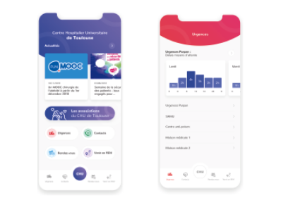 - l’app « guide patient » pour privilégier l’expérience patient et mettre à disposition des usagers un ensemble d’informations pratiques et mieux gérer son séjour : accès direct aux services utiles (prise de RDV, facturation, service repas, pré-admission…), temps d’attente aux urgences, actualités de l’hôpital, quiz, podcasts, annuaires des médecins et spécialités, informations sur le parcours de soin…